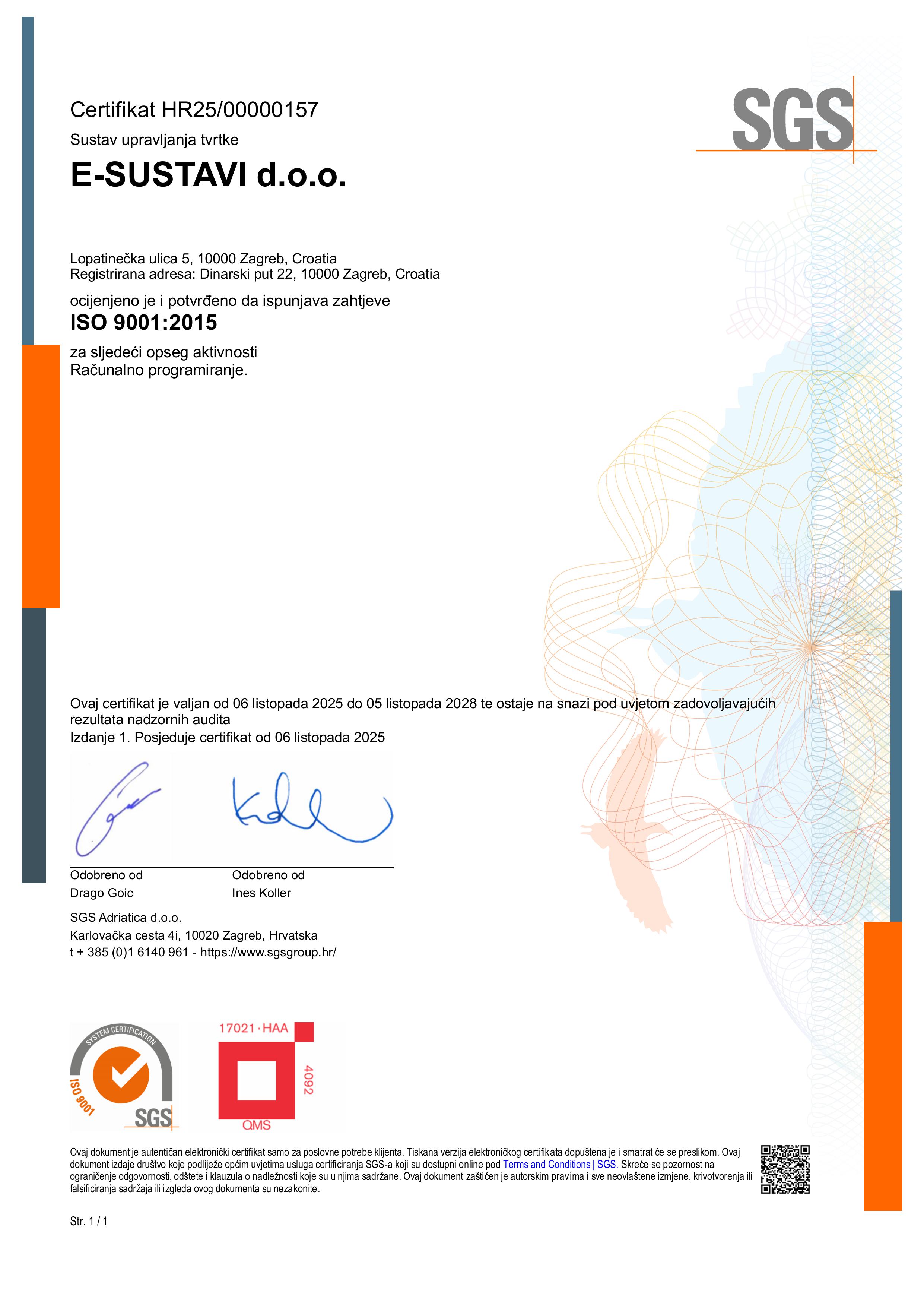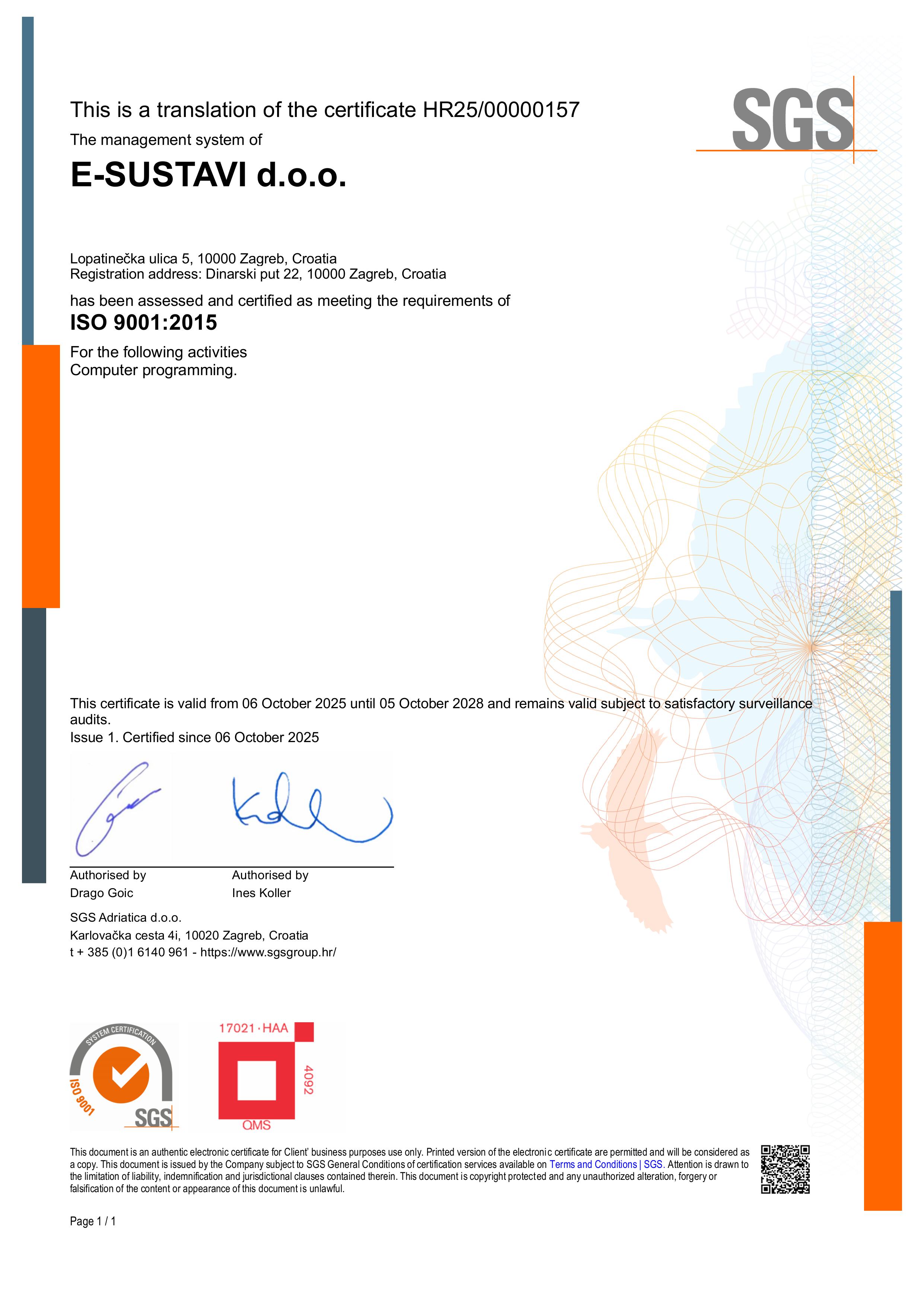 U skladu s misijom i vizijom, primjenom ISO 9001 standarda i modernih digitalnih rješenja, u E- sustavima stalno unaprjeđujemo radne procese, s ciljem povećanja učinkovitosti, pouzdanosti i kvalitete naših usluga.